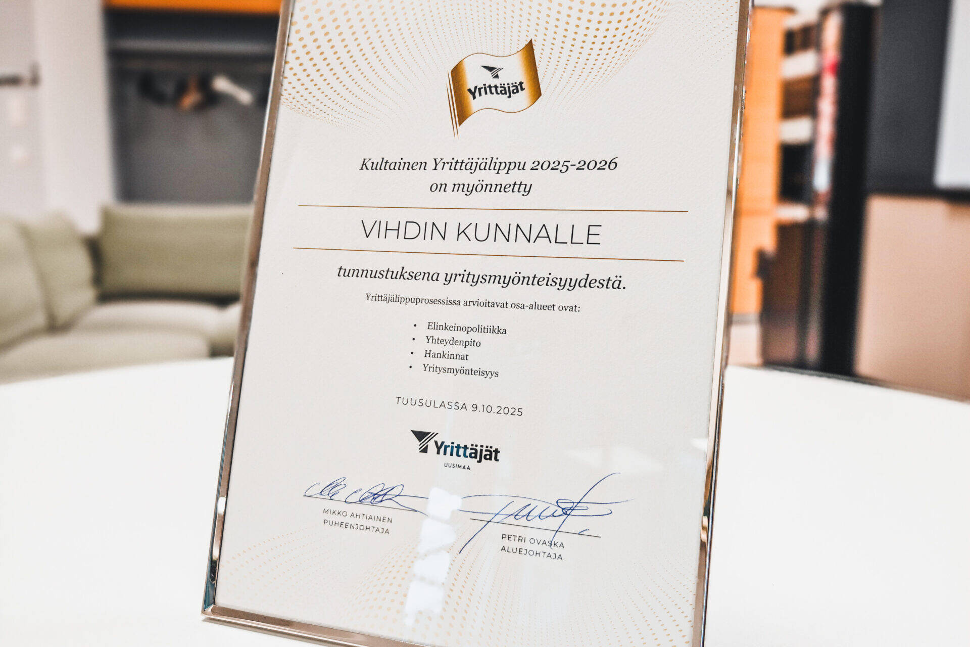 Vihdin kunta on saanut arvostetun Uudenmaan Yrittäjien kultaisen yrittäjälipun…