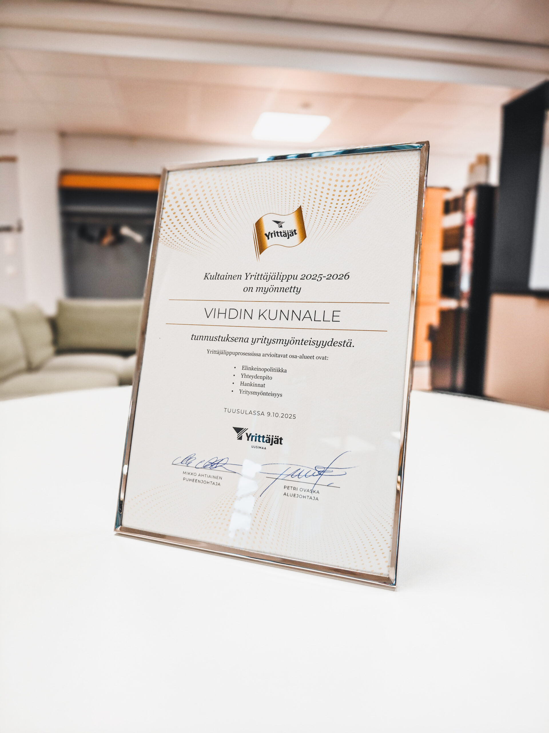 Vihdin kunta on saanut arvostetun Uudenmaan Yrittäjien kultaisen yrittäjälipun…