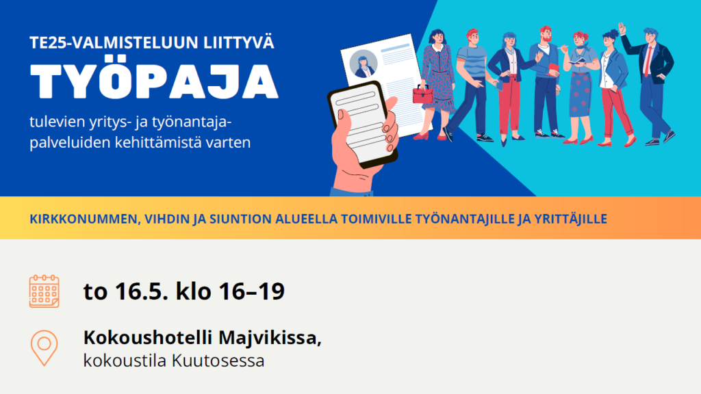 Kirkkonummen, Vihdin ja Siuntion työllisyysalue yhdessä alueen yrittäjäyhdistysten sekä Helsingin seudun kauppakamarin kanssa kutsuvat alueen työnantajat ja yrittäjät TE25-valmisteluun liittyvään työpajaan koskien tulevia yritys- ja työnantajapalveluita sekä verkostoitumaan alueen muiden työnantajien ja yrittäjien kanssa.